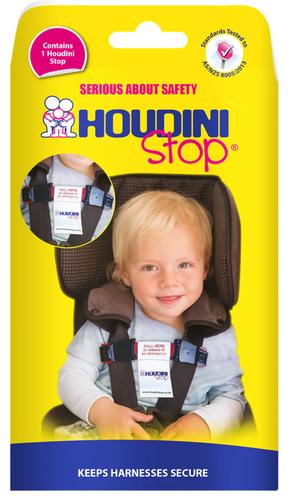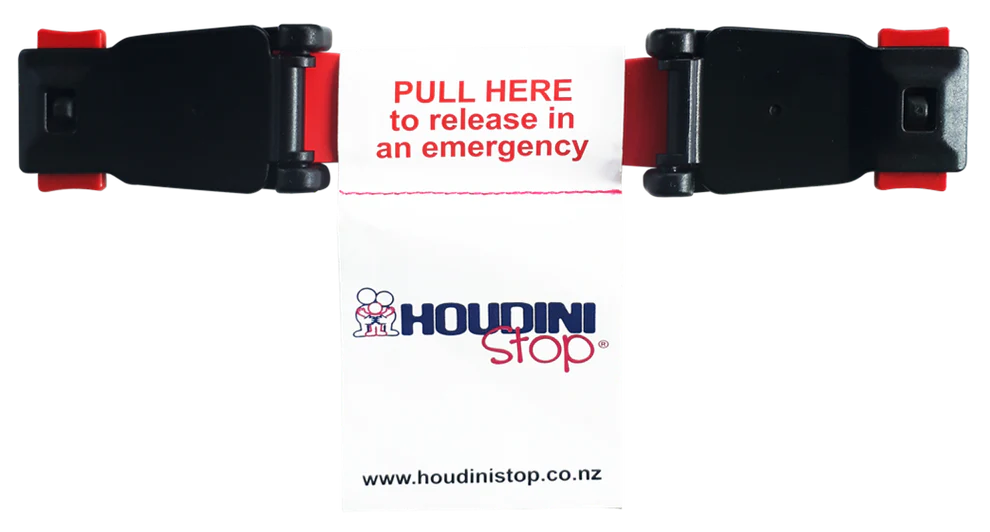 The Houdini Stop Chest Strap is a device which prevents your child from taking their arms out of their car seat straps. It consists of two simple clips joined by a length of red silicon.
